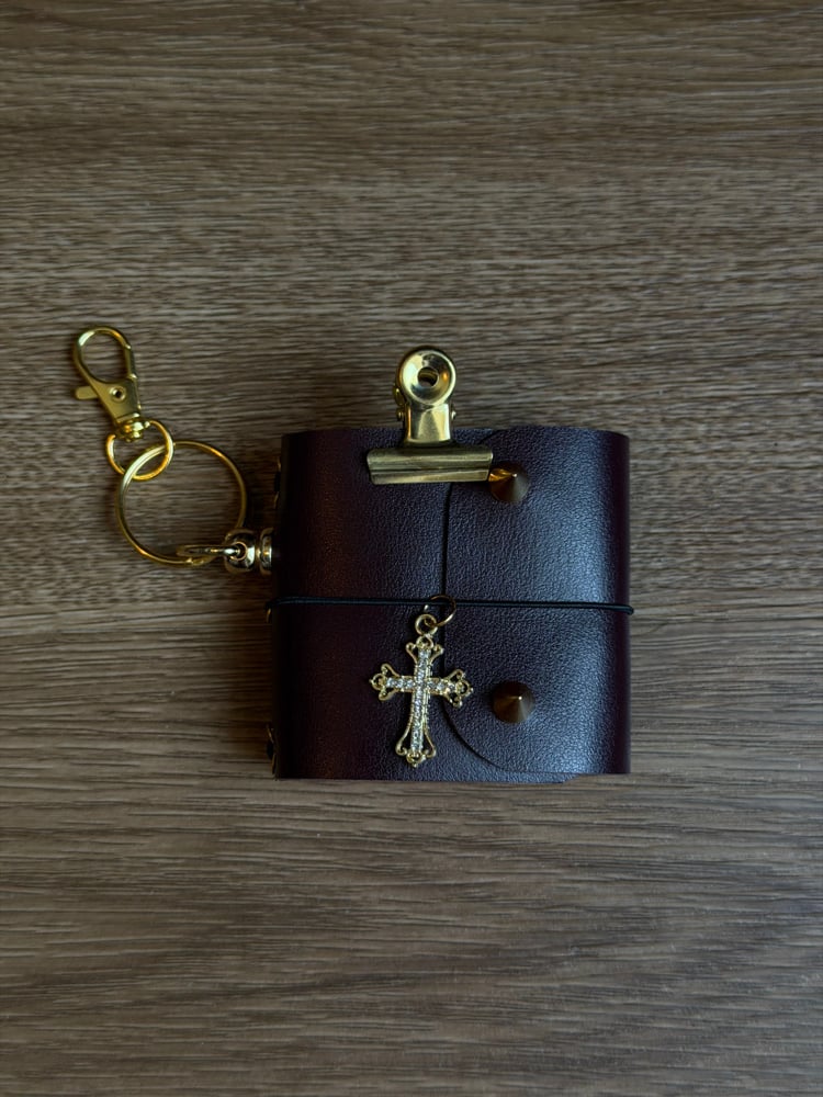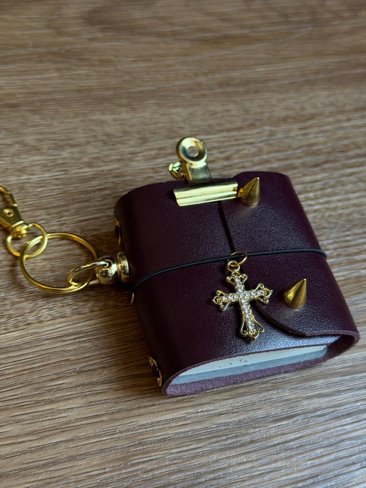 Baby Bronte is a burgundy, Italian leather tiny tri fold journal bag charm/keyring with a luxurious natural grain, smooth texture and refined satin finish.