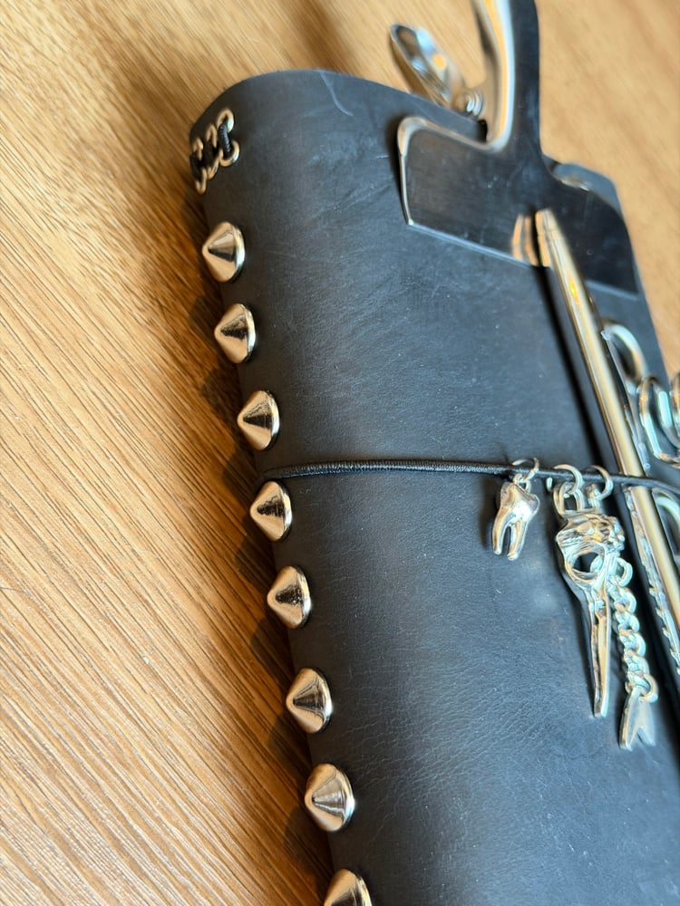 • Adorned with silver small spikes along the spine and large eyelets on the fold.