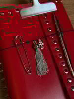 • Silver pen, large silver clip and oversized safety pin.