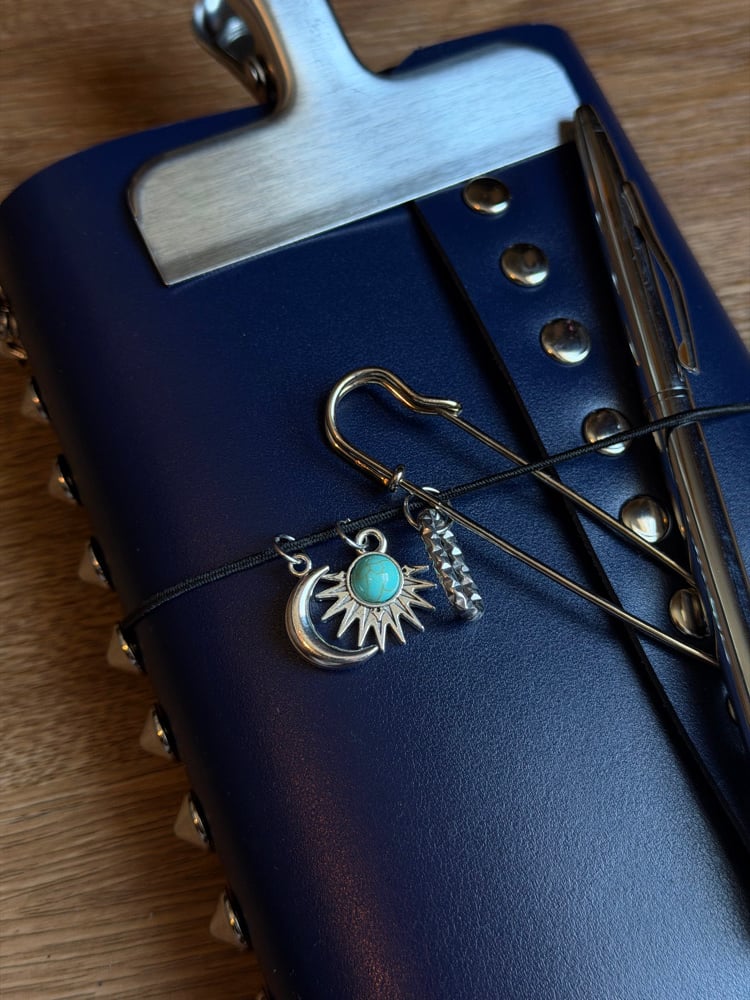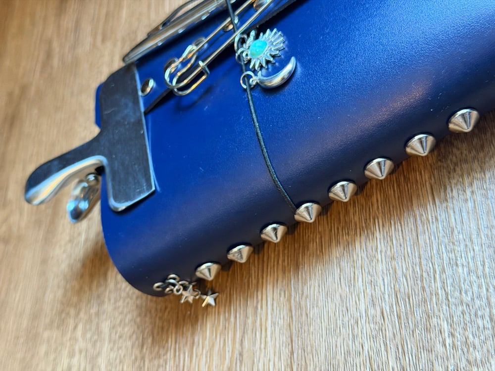 • Adorned with silver studs along the fold and small spikes on the spine.
