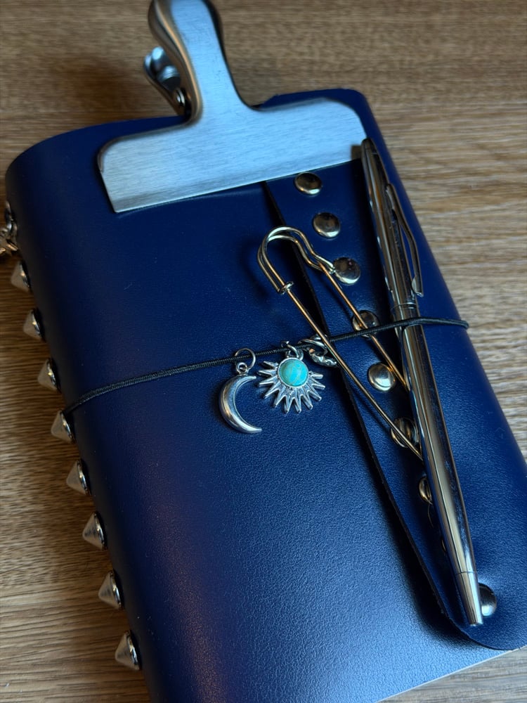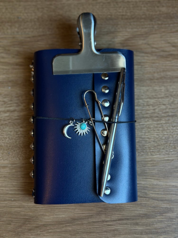 Elora is a gorgeous celestial blue Italian leather a6 tri fold journal with a luxurious smooth texture and satin finish.