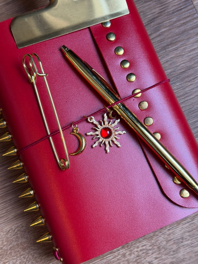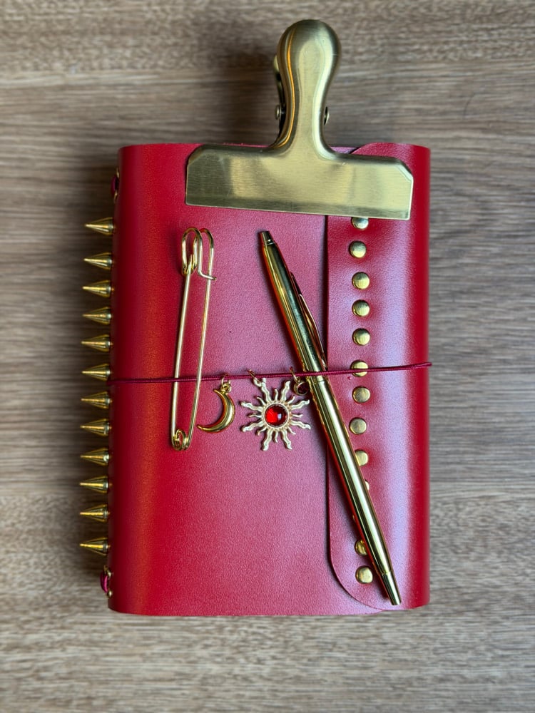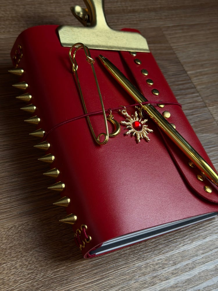 • Adorned with gold studs along the fold and spiked down the spine.