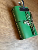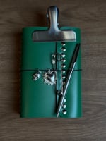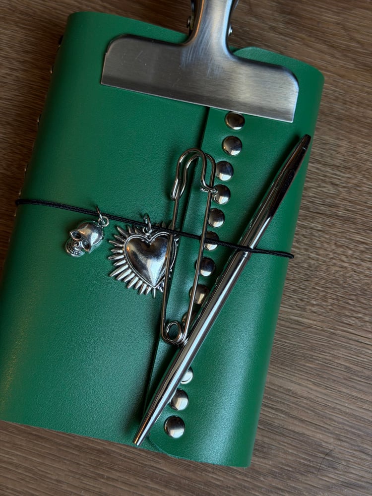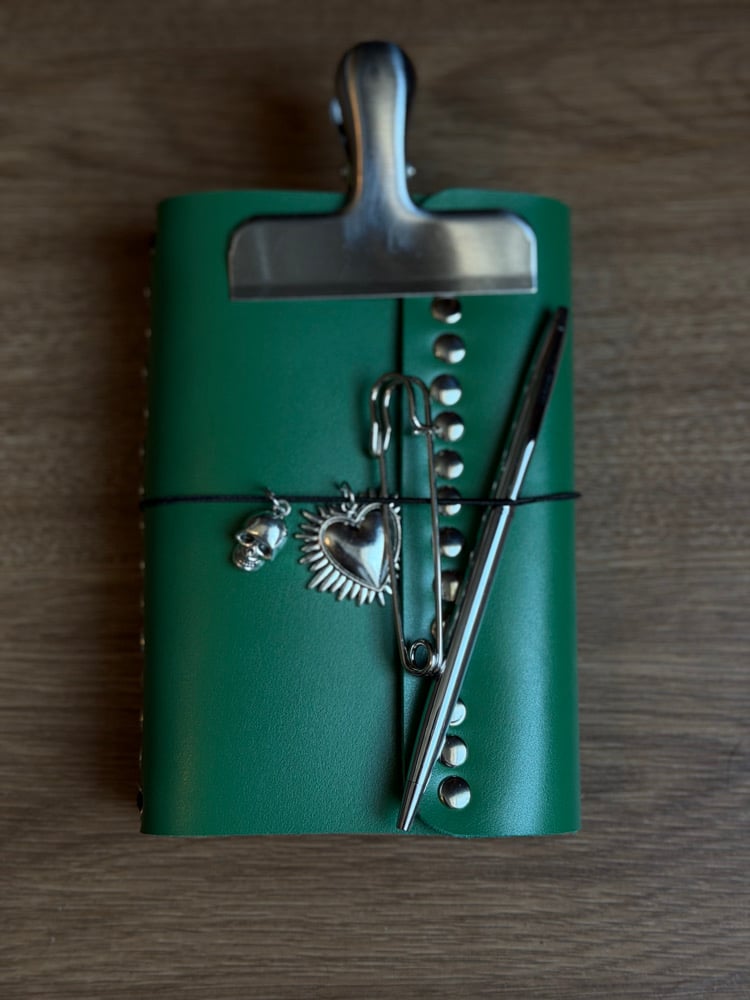 Grace is a vibrant green Italian leather a6 tri fold journal with a luxurious smooth texture and satin finish.
