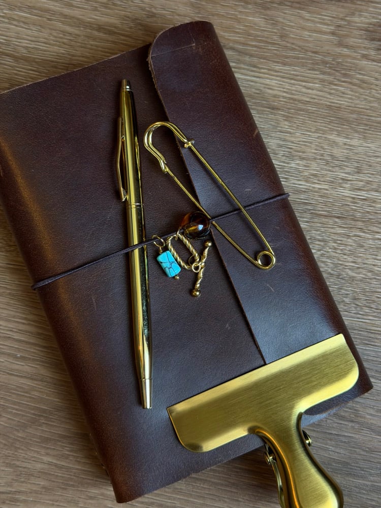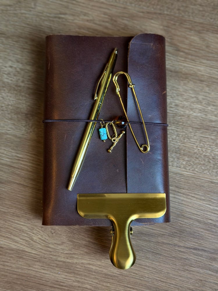 • gold pen, large gold clip and oversized safety pin.