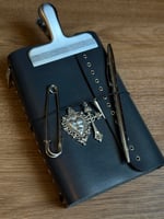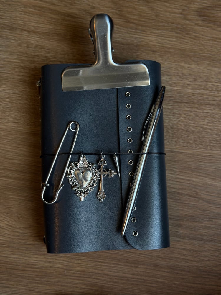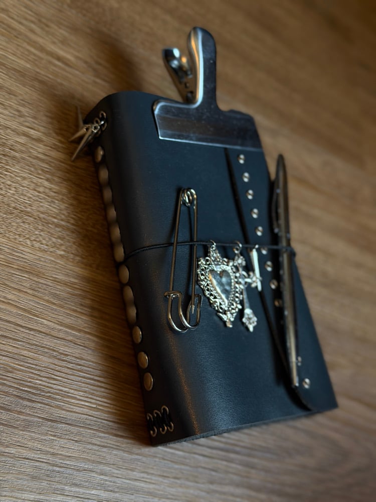 • Adorned with silver studs along the spine and eyelets along the fold.