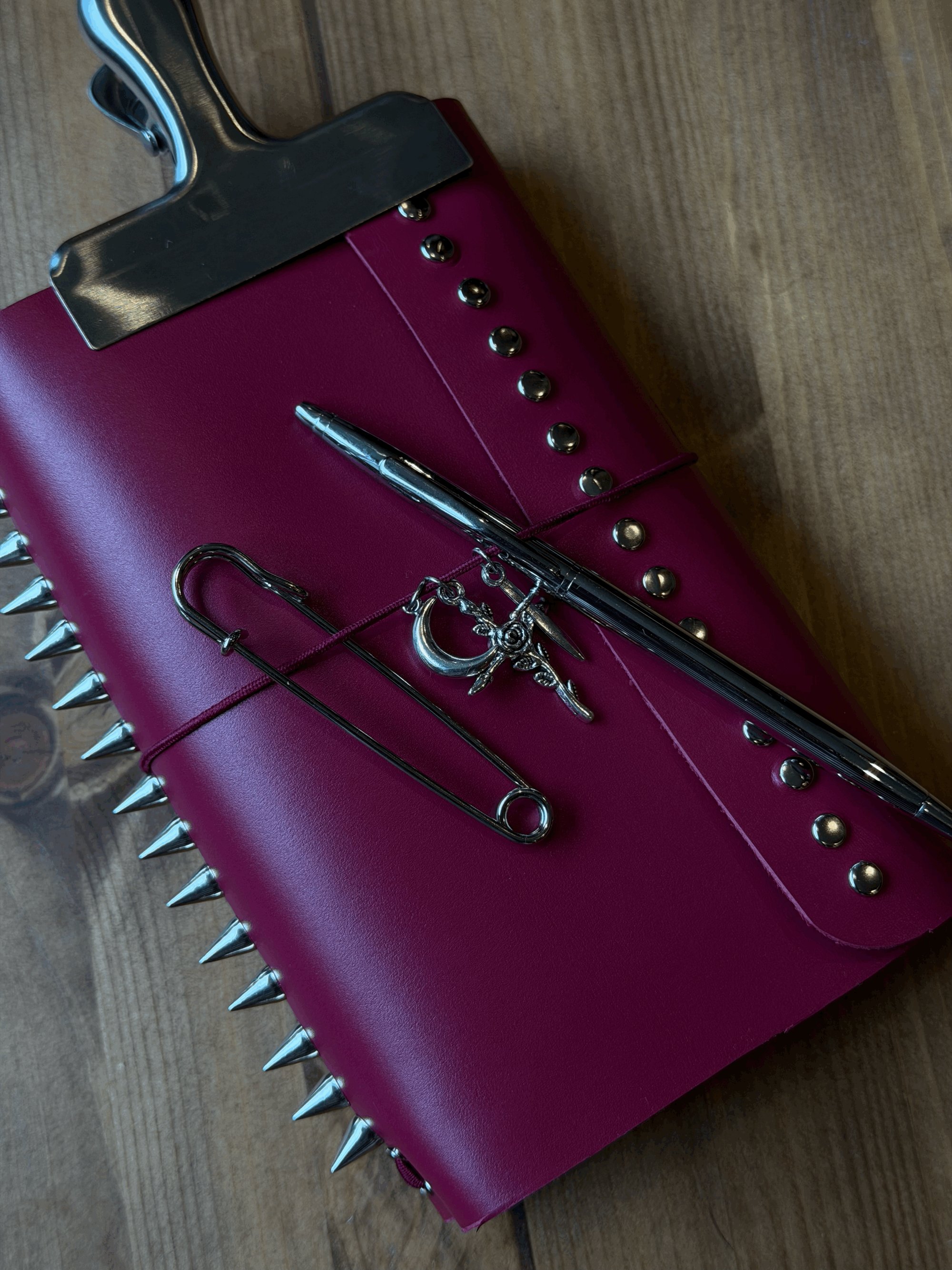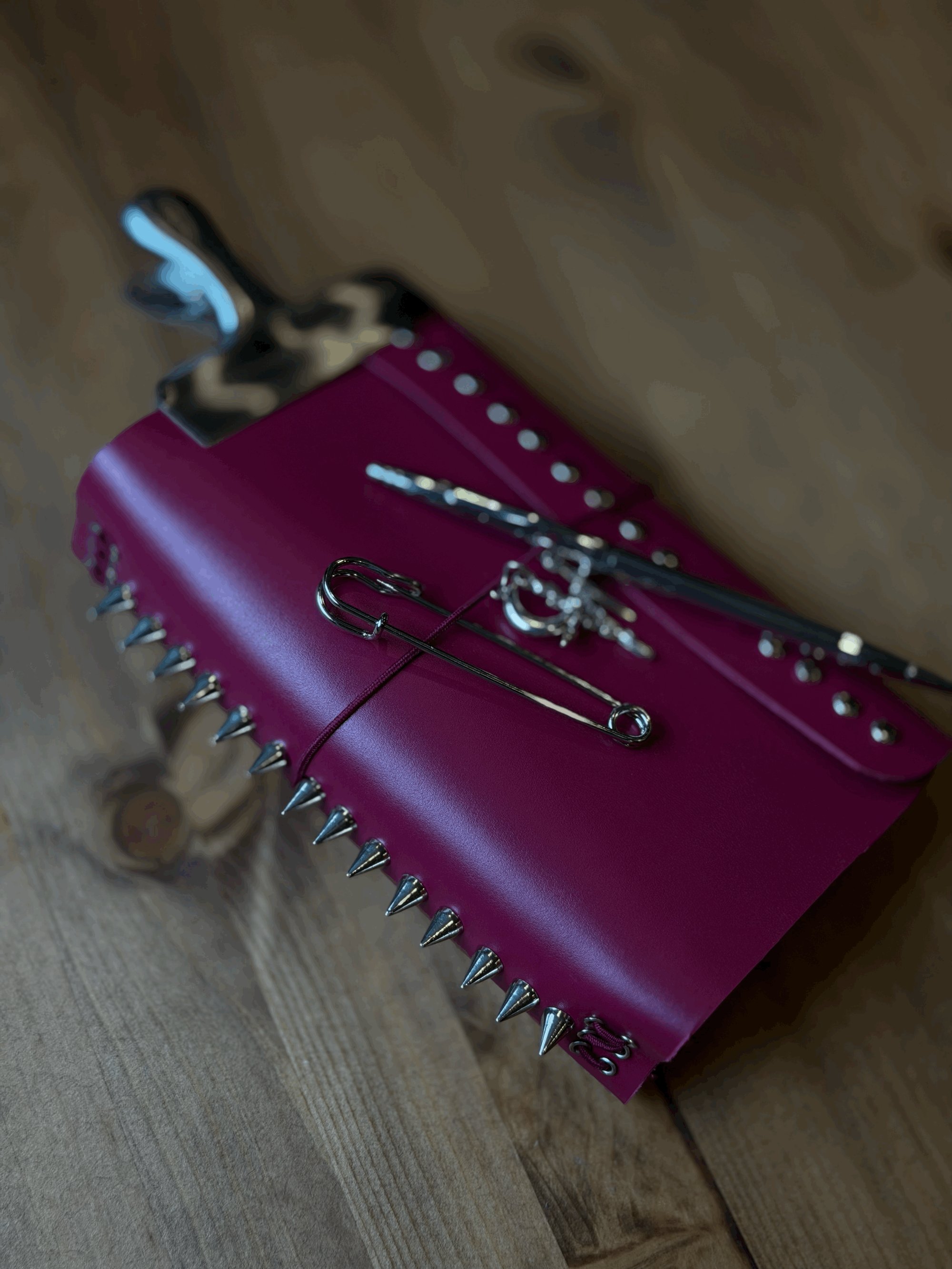 - Adorned with silver spikes down the spine and eyelets along the folded edge.